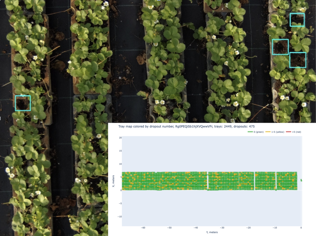 Our proprietary vision algorithms detect missing cells (dropouts), count trays and plants, and calculate dropout percentage per batch.